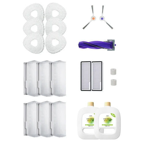 Package Contents | 6 x Mop 6 x Dust Bag 2 x Filter 1 x Rolling Brush 2 x Cotton Filter 2 x Side Brush 2 x Cleaning Solution |